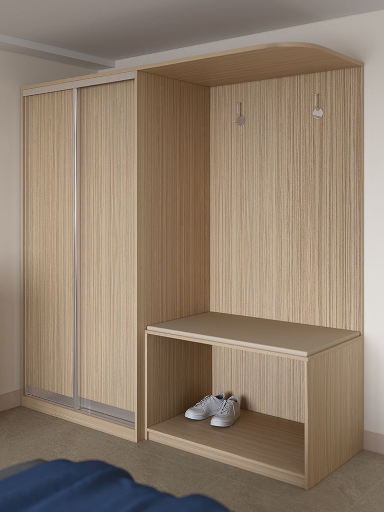 Шкаф-купе включает в себя 2 отделения — для белья и для одежды, вешалку и багажницу под общей панелью или козырьком со встроенными спотами.