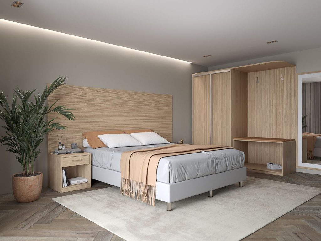 Эта серия мебели позволяет оборудовать даже небольшие номера и нестандартные по размерам помещения. Благодаря компактным размерам, гостиничная мебель КРЕДО идеально впишется в узкие и вытянутые « чулком » комнаты, оставляя достаточно свободного пространства. Экономить полезную площадь гостиничного номера также позволяет наличие шкафа-купе.